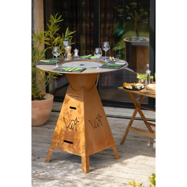 Charbon de bois ou Gaz, réversible en 1 min. Table haute type mange debout. inclus plateau central, grille de cuisson, kit raccordement et bruleur Gaz, ou charbon de bois. Fonctionnement au gaz avec une plaque en inox alimentaire, ou au charbon de bois avec une grille de cuisson.